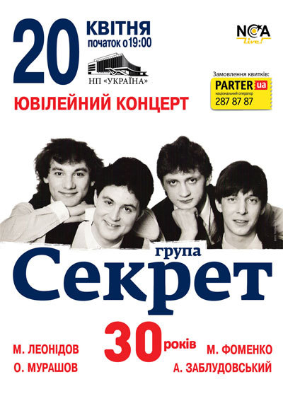 20 квітня 2013 в Києві, в Палаці «Україна», відбудеться подія, на яку так довго чекали всі вітчизняні меломани! Вперше за багато років у своєму «золотому» складі виступить легендарна «ленінградська четвірка» - біт-квартет «Секрет»! На сцену вийдуть Максим Леонідов, Микола Фоменко, Андрій Заблудовський та Олексій Мурашов, щоб відсвяткувати 30-річчя найромантичнішого і найпривабливішого колективу вітчизняної рок-сцени і виконати свої найкращі пісні!